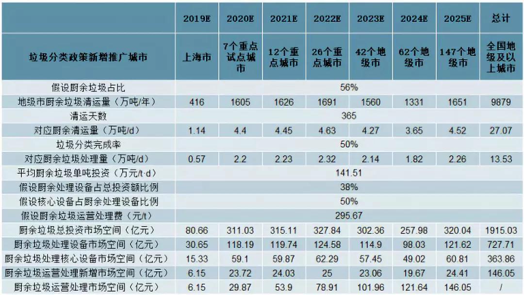 以100個餐廚垃圾試點城市的平均餐廚垃圾項目單噸投資額76.6萬元/t,處理費197元/t作為合理估計值,可得上海環(huán)境松江、上海環(huán)境嘉定、海峽環(huán)保福州、首創(chuàng)環(huán)保寧波(一期)4個項目的平均廚余垃圾單噸投資額為141.5(萬元/t)。考慮到廚余垃圾的綜合處理費較高,假設廚余垃圾處理費是餐廚垃圾的1.5倍為295.7(元//t•d),以地級及以上城市平均每天產(chǎn)生約27萬噸廚余垃圾測算,在中性情景下(即垃圾分類完成率為50%),廚余垃圾總投資額市場空間為1915億;按廚余垃圾處理設備占總投資額的38%,核心設備占廚余處理設備的50%計算,對應市場空間為364億;2025年廚余垃圾運營處理市場的空間預計可達146億元,市場空間廣闊。